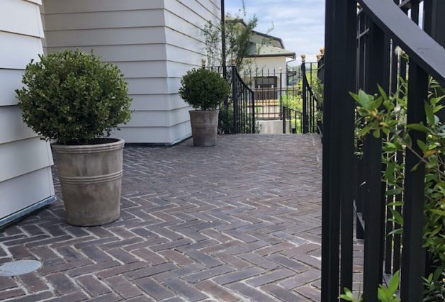 玄関側のウッドデッキが老朽化したのと駐車場部分を拡張するために2020年に二期工事を行いました。カントリー調から少しクラシックな印象にと言うご要望から、建物に合わせ玄関を中心にシンメトリーにアールの階段を両サイドに設けました。手摺りとフェンスにはスチール無垢材を使用し、ギボシは表札に合わせたゴールドの塗装を施しました。駐車場は傾斜がきつかったため、一度舗装部分を壊し床面を下げ、車二台が十分に止められるように奥行きも拡張しています。アプローチ全体と駐車場はベルギーからの輸入スライスレンガをヘリンボーン張りで敷き詰めています。
