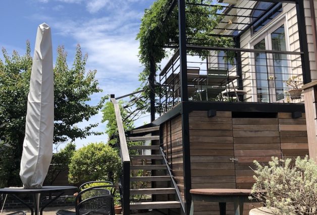 1・2階を繋ぐ階段の中間に位置する踊り場に掃き出し窓がありましたが、購入されたときには外階段はない状態でした。庭へは動線がなく、玄関側からしか行けないようになっていたため、その部分から着手することになりました。海沿いのため溶融亜鉛メッキの鉄骨造躯体に塗装をし、テラス、階段のステップ共床面はイペ材を使用しています。堅牢なつくりでありながら、木材の素材感が印象を和らげる仕様にしています。テラス上部にはパーゴラも設け、フジで緑陰を作っています。