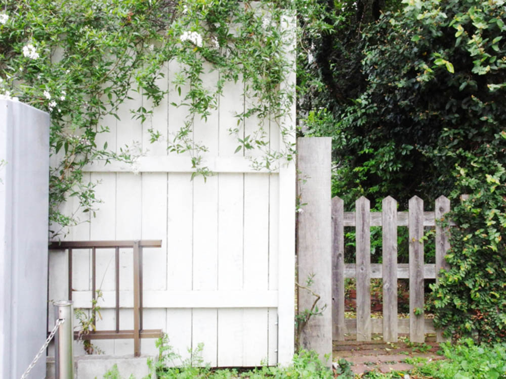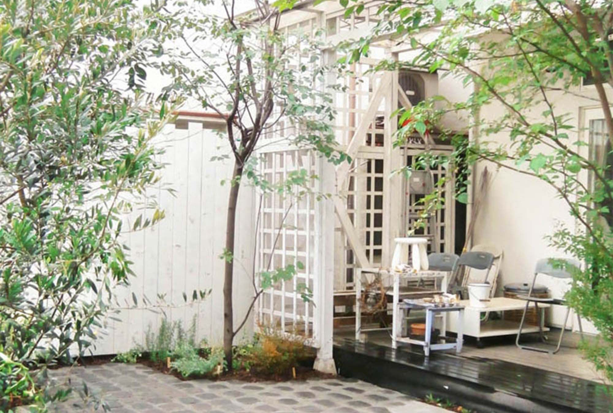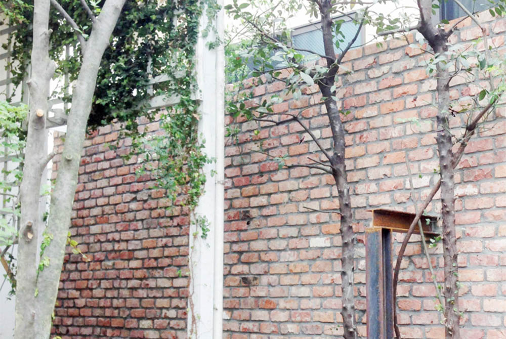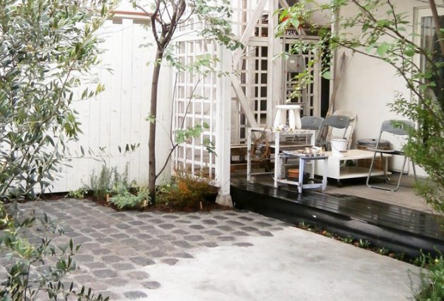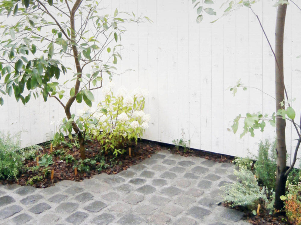 最初に中庭を囲むフェンスの一部と舗装・植栽を行い、3年後、老朽化し壊れかけたフェンスを撤去し、壁を新設しました。床は古い花崗岩を敷き詰め、コンクリート部分も風化したような雰囲気に加工してあります。白い木製フェンスもヤスリで加工して、経年変化が出たような仕上げにしました。隣地との境界には鉄骨で躯体を組んだ高さ2.5mの高い壁には、アンティークレンガを張り、モッコウバラを絡めています。