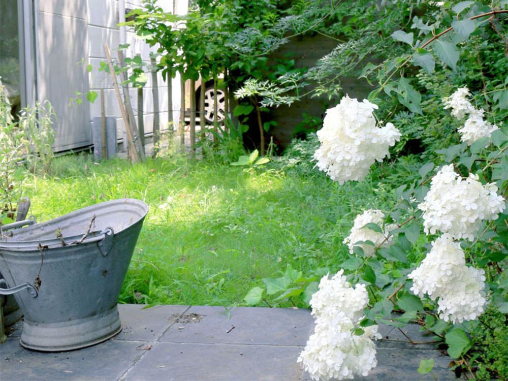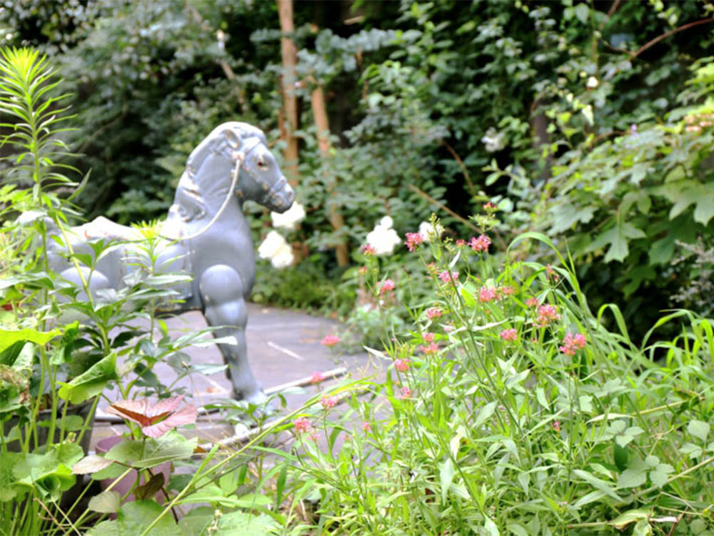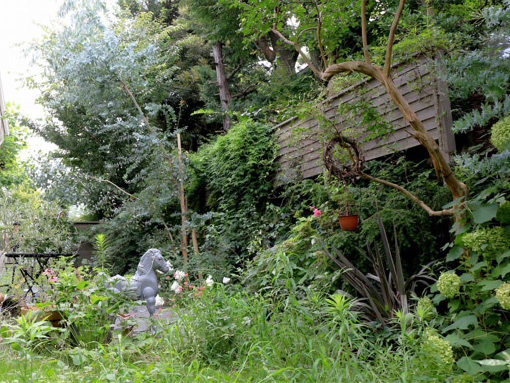 Works 012 世田谷区の家 隣家からの目隠しのため、ナチュラルカラーのウッドフェンスとウィローフェンスを設置し、既存の壁と共にバラやジャスミンなどのツル植物を這わせ緑溢れる庭に。既存のサルスベリやモクレンは活かし、新たにマルバのユーカリやギンヨウアカシア、ノリウツギや多年草他、沢山の種類の植物を植えています。雑然としたグリーンの中で、木馬やブリキのバケツなどの雑貨がポイントになっています Date: 2012 Area: 75m2 Type: 戸建リノベーション タグ ウッドフェンス 植栽 1 / 2 2 / 2