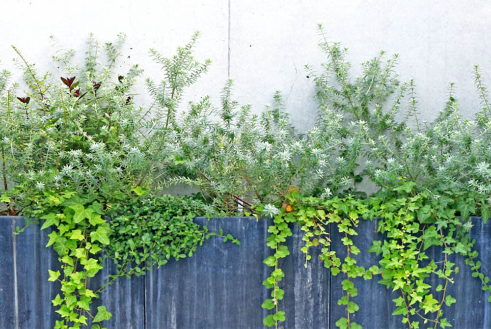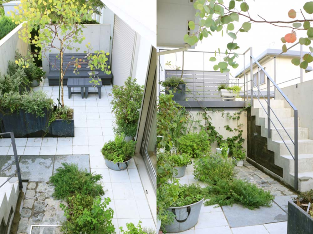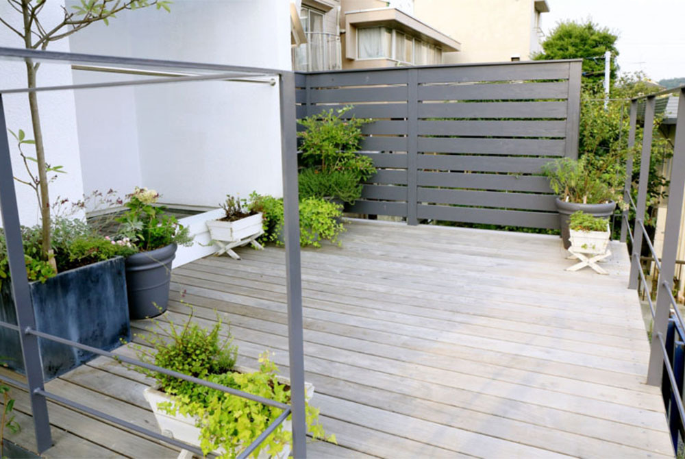 駐車場の屋根の上にウッドデッキを作り、一階リビングに面した庭からデッキに上がれるように、既存のRC壁と合わせた階段を設け、建物外観のモダンな雰囲気に合わせスチール製の手摺を合わせました。水はけが悪く雑草が生い茂っていた土の部分は、テラス部分の面積を広くするため一部植栽エリアを残し石材で舗装しています。テラスにはプランターとベンチをレイアウトし、家族が寛げるスペースに仕上げています。