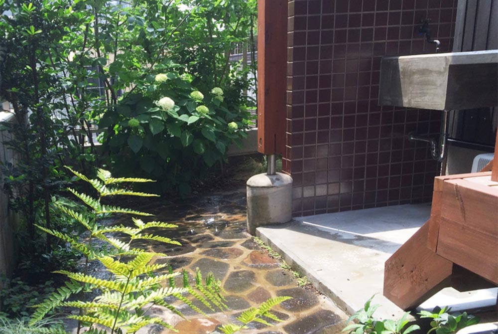 一番奥に当たるスペースには物置小屋を設け、デッドスペースになりやすい奥のペースまで景色と機能で役割を持たせ有効活用をしています。