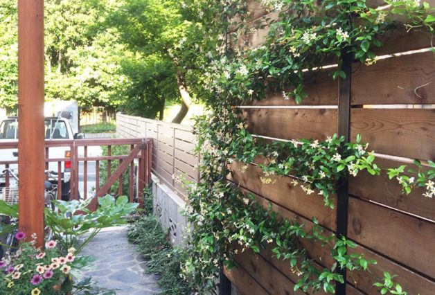 リビング掃き出し窓に面した部分では縁側に沿った1m程の限られた幅で景色をあきらめず、通路も確保するため高めのフェンスを設けツル植物を這わせています。
