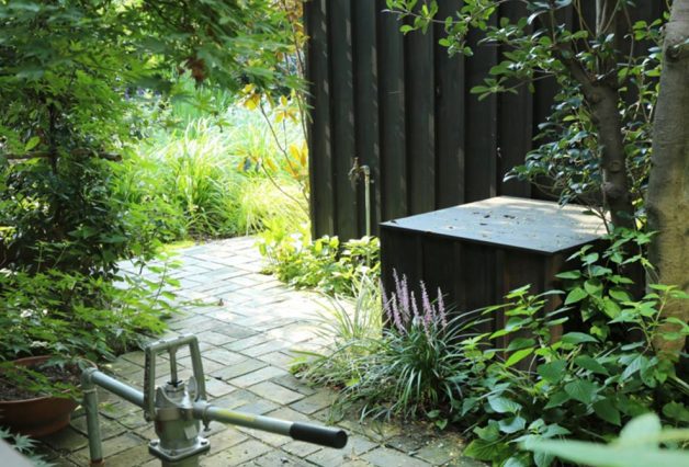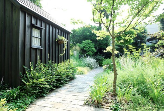 既存の樹木はできるだけ残し、グレーのレンガで園路を舗装し、母屋の勝手口に面したエリアは広く石のテラスにすることで管理しやすいレイアウトにしています。