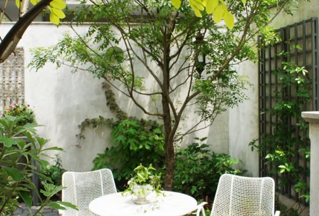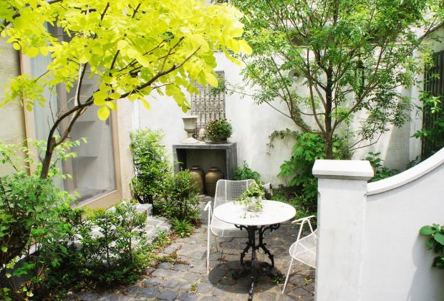 老朽化した万年塀の交換と共に使われていなかった裏庭をリフォームしました。ご自身で植えられたニセアカシア・フリーシアを移植し、隣家の2階のベランダが隠れるように常緑のシマトネリコを植えました。床は玄武岩の古いものを通路、テラスと同素材で敷き詰めています。