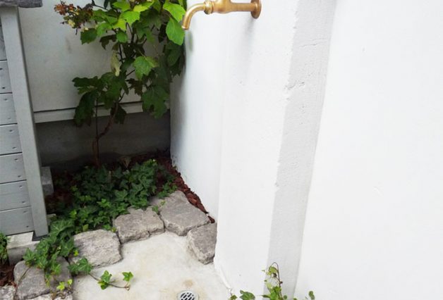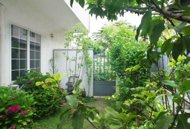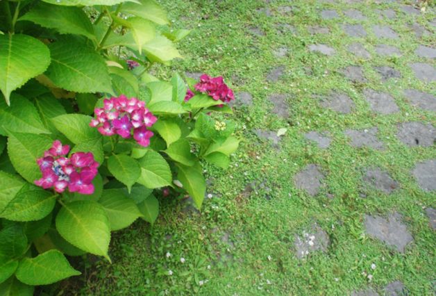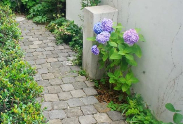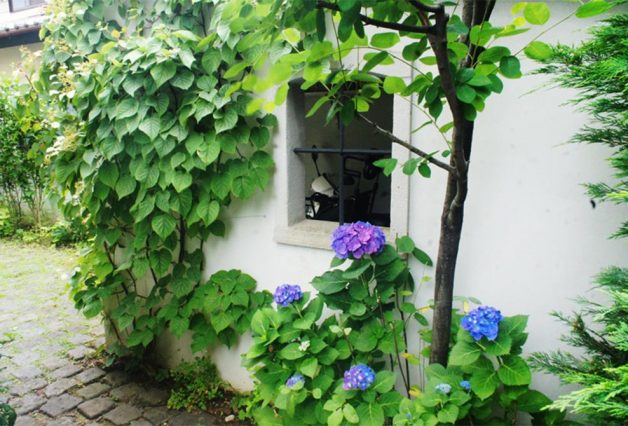 キッチンから出られる中庭は古い玄武岩を敷き込みテラスにしています。日当たりが良くないためアジサイを中心に、目隠しにはソヨゴやシマトネリコ等の常緑樹を植えています。