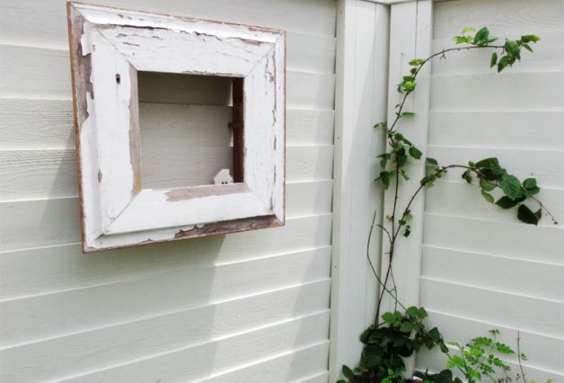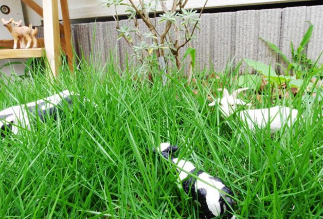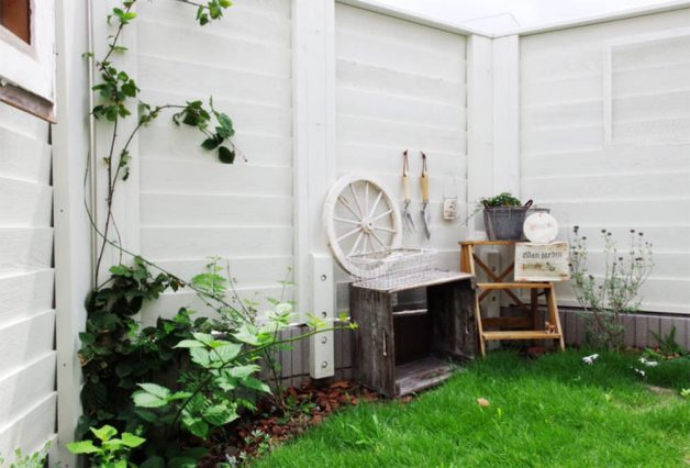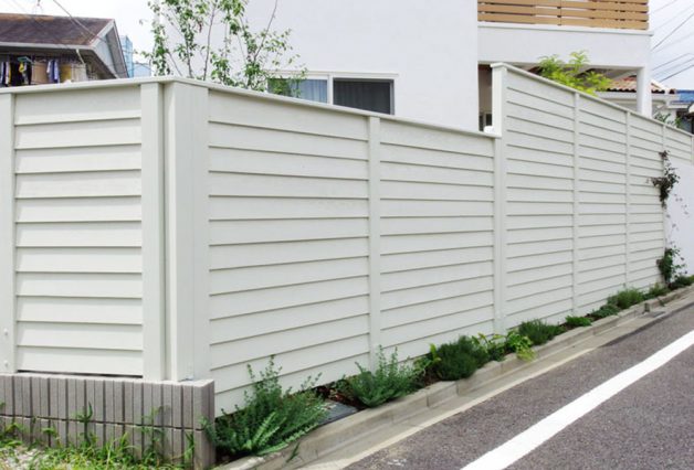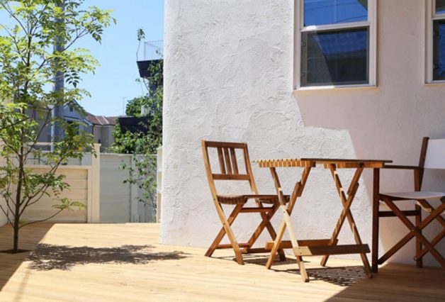 日当たりのとても良い角地に建つ、南欧をイメージした造りの建物。道路に面した部分は木製のフェンスで囲い、内側は敷地いっぱいにウッドデッキを設置しています。
