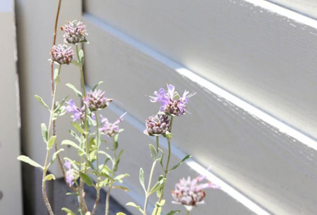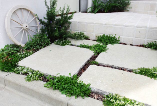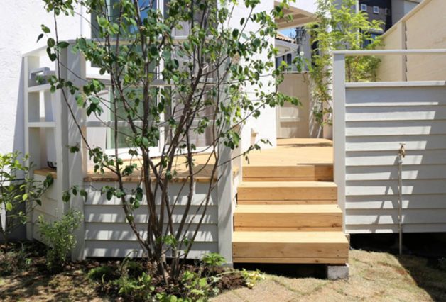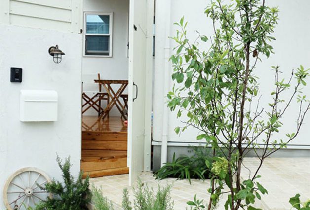 デッキにはエントランス脇から入れるように扉を設け、トラバーチンの石材を張った玄関ポーチのスペースも、ベビーカーが上りやすいように、ステップの幅を広めにとっています。リキュウバイやアジサイ・アナベル、コンボルブルスなどが季節ごとに玄関前を彩ります。
