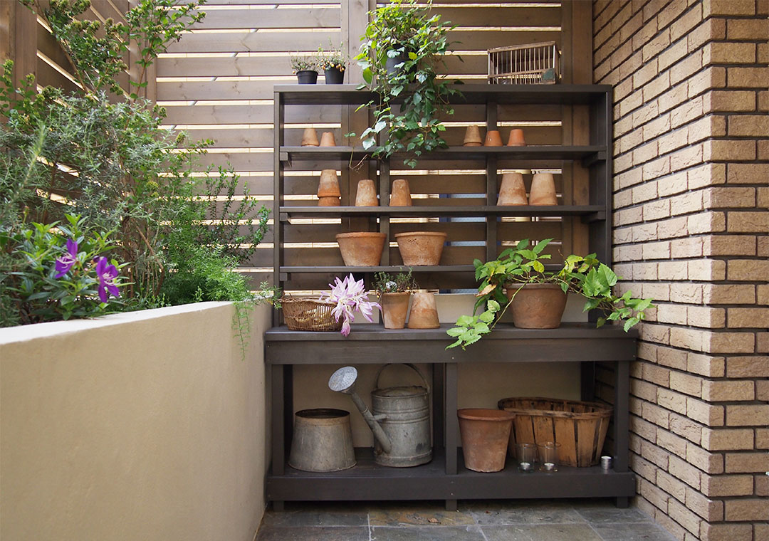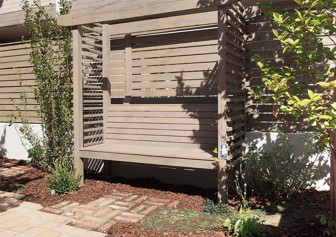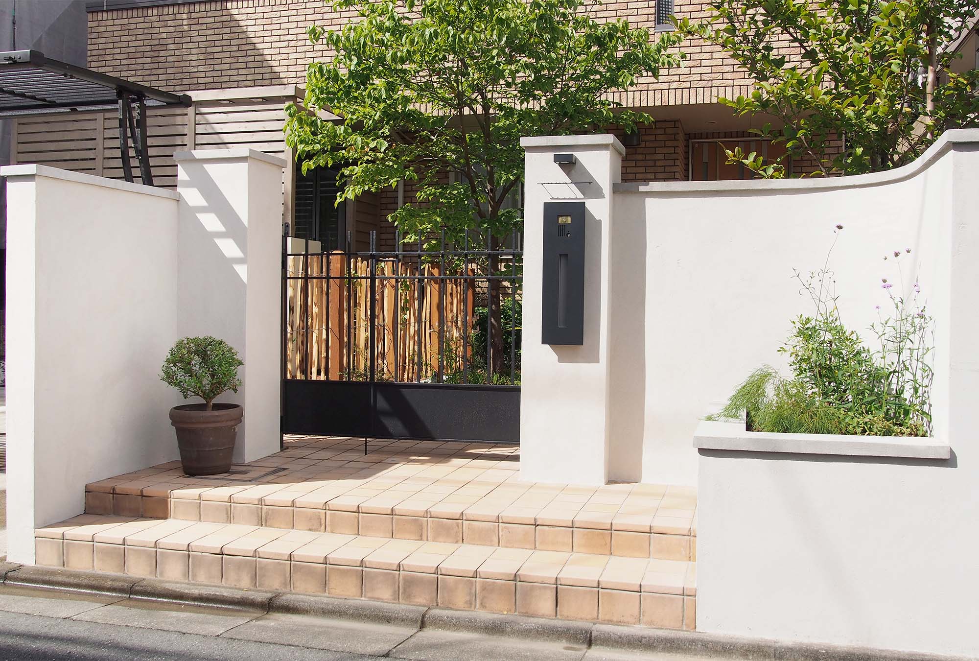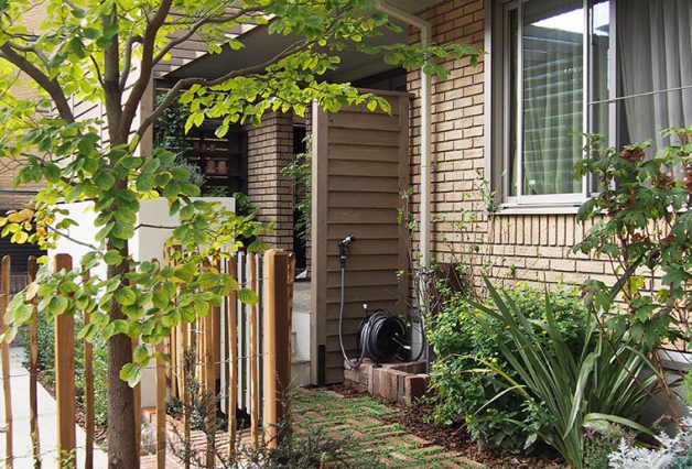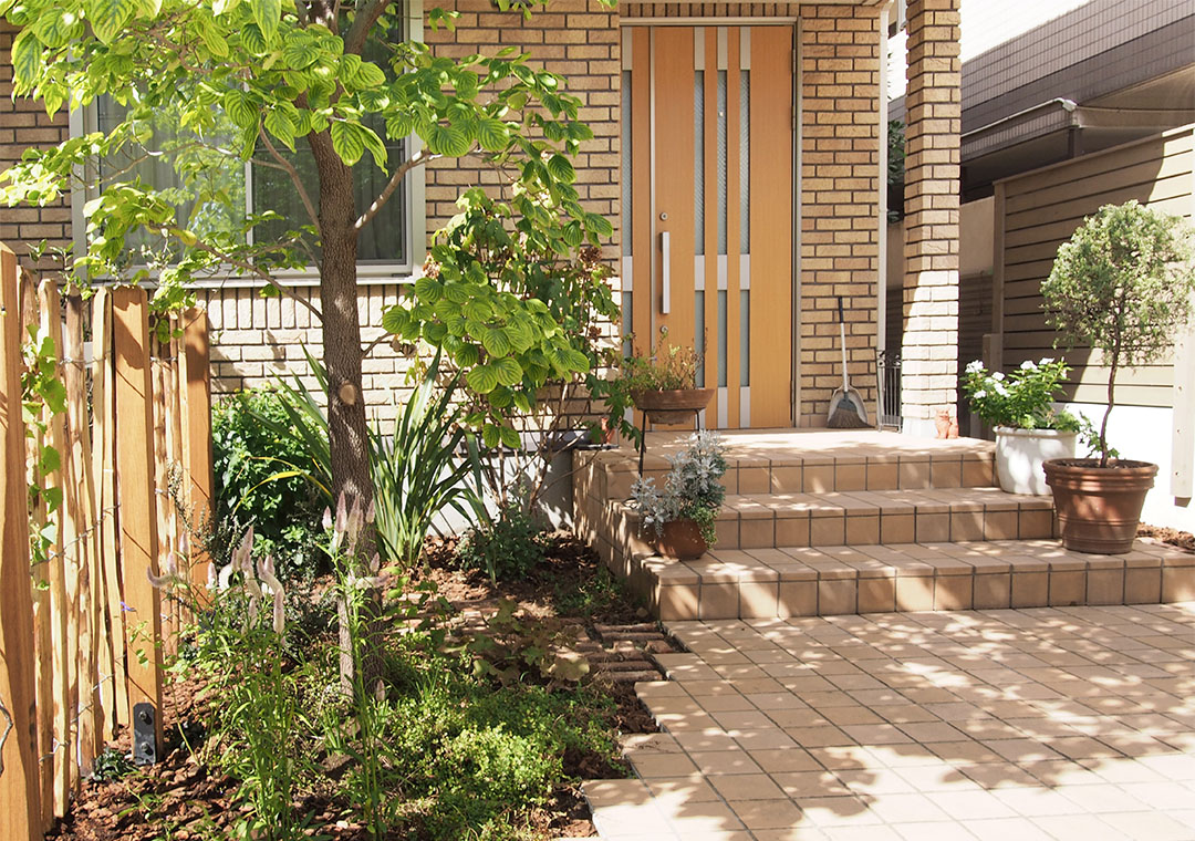Works 038 葛飾区の家 既存のブロック塀に手を加え、左官塗りとロートアイアンの壁に一新。 シンプルながら表情のあるロートアイアンが引き締め役になっている。門扉を抜けたパーゴラ付きのベンチにはクレマチスを絡ませてあり、花が覆う頃が楽しみな作りである。 テラスは花壇をつくり奥行きを広げ、ウッドフェンスで囲みくつろげる空間に。リビングから観ると植栽の緑と造作で作った飾り棚が彩りを添えている。 Date: 2016 Area: 53m2 Type: 戸建リノベーション タグ ウッドフェンス パーゴラ付きベンチ レンガ舗装 植栽 鉄扉 門柱 1 / 1