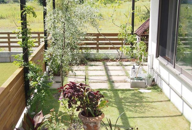 良い景色を上手く取り込めるように、ある程度ウッドフェンスで囲い、目地の間隔で抜け感を調整した。