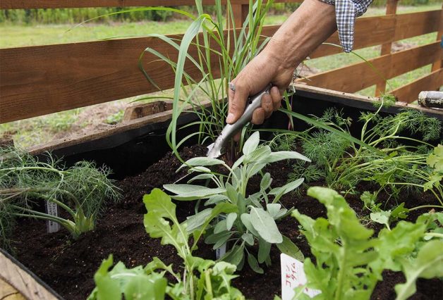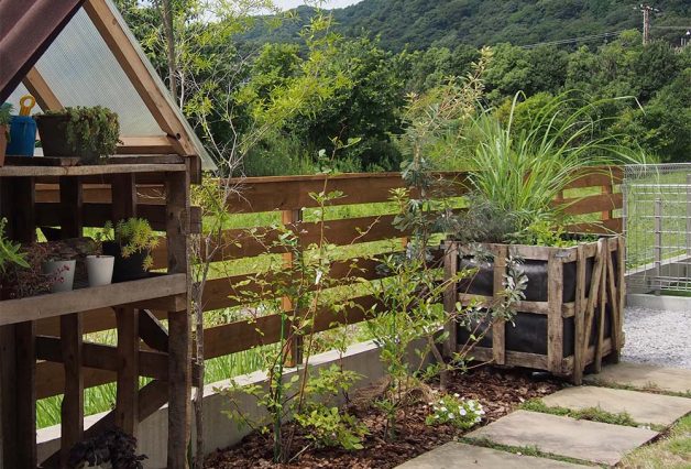 奥の空間には菜園コーナーがある、飾り棚とコンテナ(ともに廃材利用)、がアクセントに。植栽は藤とすこしノスタルジックな色調の植栽、ロシアンオリーブがシンボルツリー。