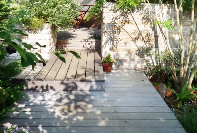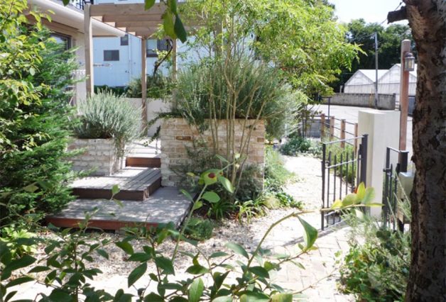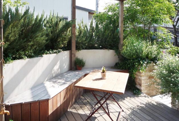 そのままでは道路からリビングが丸見えになってしまうため、リビングの掃き出し窓に面した部分にウッドデッキでテラスを作り、その脇に高さのある細長いコの字の花壇を作り、ローズマリーを植えています。
